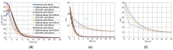 Simulation results of adaptive cruise control using fixed/optimal decay and our general and optimizable form of CLF-CBF-QP with different initial velocities. Different colors represent different initial conditions. For our general and optimizable form of CLF-CBF-QP, (a–c) are the results of and (d–f) are the results of , while all of them use the same : (a) ego vehicle’s speed; (b) values of control barrier function; (c) actual safety margin; (d) ego vehicle’s speed; (e) the CBF h(x) values; (f) actual safety margin.