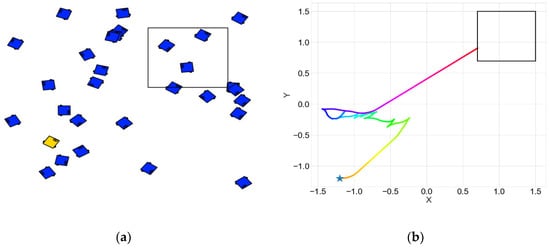 Collision Avoidance Among Multi-Agents. The ego agent is represented as yellow, while other agents used as dynamic obstacles are represented as blue: (a) a snapshot of the simulation; (b) a trajectory of the ego agent.