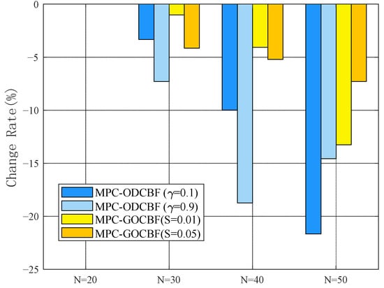 Table 1 shows that as the number of other dynamic agents increases, the success rate decreases because the problem becomes more difficult. Moreover, if the safety restriction level is relaxed (increasing in MPC-ODCBF or decreasing in MPC-GOCBF), the success rate will increase for both methods, which indicates that, in this example, the safety restriction level and feasibility are in conflict. Nevertheless, it can be seen that our MPC-GOCBF has a more intuitive and clear meaning with the safety restriction level set by , which is more convenient for real applications. Moreover, to analyse the sensitivity [45] of the parameter N (the number of dynamic obstacles) on the final performance metric Success Rate, the Change Rates of different methods on Success Rate (N = 20) are given in Figure 10. As the number of obstacles increases, compared with MPC-ODCBF, it can be seen that the performance of our MPC-GOCBF remains more stable with the same hyper-parameter as the number of dynamic obstacles increases.