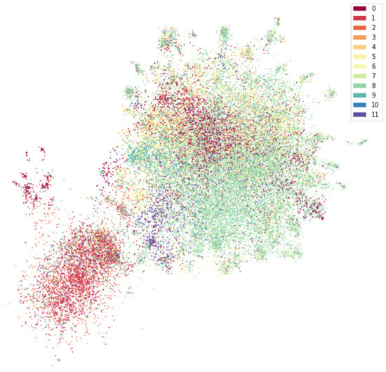 - McInnes, L.; Healy, J.; Melville, J. UMAP: Uniform Manifold Approximation and Projection for Dimension Reduction. arXiv 2017, arXiv:1802.03426. [Google Scholar]