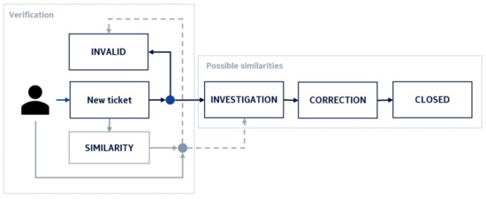 There is the possibility that testers from different offices may find the exact same error and create duplicate tickets. In the current process, there is a risk that two or more coordinators—especially from different offices and living in different time zones—will not notice that another department saw the same or similar error. Such a situation creates a strong need to enable such checking already in the phase of creating a ticket. It would improve the process by reducing the effort of coordinators and other people who can focus on different aspects of the project. Furthermore, such an improvement can lead to a situation in which all products and their versions (branches of a code) are fixed under the very same ticket.