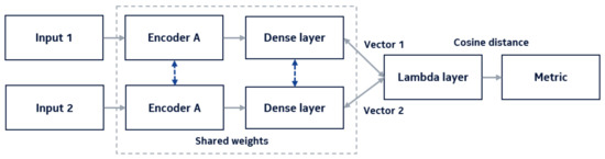 The authors of [13] worked on a comparison between different calculation methods to find text similarity using several Siamese networks. The experiment result shows that the Siamese network based on the BERT model with the Cosine Similarity metric achieved the highest accuracy rate. Based on that, we concluded to choose the Cosine Distance metric among others, like Pearson correlation coefficient, Spearman’s rank correlation coefficient or simple Mean-square error.