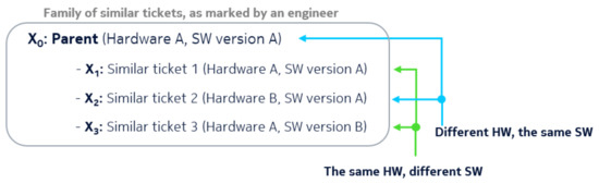 The explanation of the different types of similarity between tickets is marked as such by an engineer. The parent ticket is at the same time similar to (by having the same categorical values) and to ticket even if the following was found on different hardware.