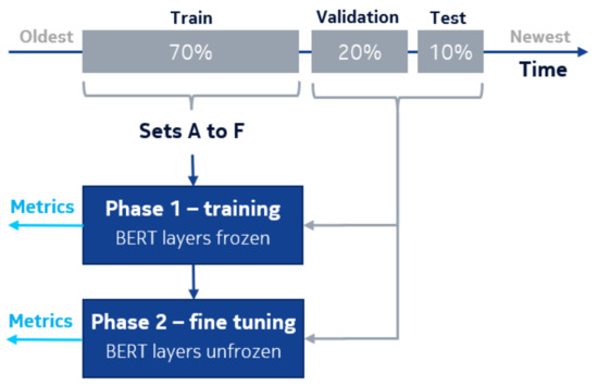 The initial dataset was divided as follows—10% of the most recent samples describing pairs of tickets (in terms of when they occurred) of each product were selected for the test set. The pairs in this set were selected as in proposal B, because of their form resembled the reality (that is, because they were marked by the testers). In this way, we reconstructed a dataset that describes the latest trends in the company’s software development process and is the same as the decisions of engineers in the company. Hence, this dataset was not altered or expanded in any way and was used to examine the training results for each dataset from A to F. From the remaining portion of the original set, an additional 20% of the most recent pairs were extracted and a validation set was created from them—these samples were selected as in the testing set. From the rest of the samples, successive versions of training sets A through F were created. The process of dataset preparation and models training is presented in Figure 5.