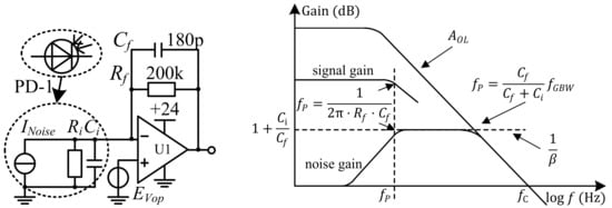 A small non-magnetic Silicon (Si) PIN photodiode is used. Its rising edge time is 25 ns and its junction capacitance value is 10 pF. A preamplifier circuit composed of an ultra-low noise high-speed operational amplifier chip (U1) converts the current signal into a voltage signal, making the photodiode work in a reversed bias state. The feedback resistor in the preamplifier circuit is selected by the actual photocurrent and its required gain. Without a feedback capacitor, the circuit is prone to gain bump, step output ringing, and noise gain spikes. To eliminate the above problems, a small capacitor is added to in parallel. The gain–frequency characteristics of noise gain and signal gain are shown in Figure 2 (right), where log is denoted by log f and and constitute a pole in the frequency response of the amplifier, as shown in Equation (1). If the open loop gain () curve crosses the noise gain (1/) curve as it rises, the circuit may oscillate uncontrollably. Another name for noise gain is closed-loop gain, which is always defined as the reciprocal of the feedback factor (). The signal gain of an operational amplifier circuit is not always the same as its noise gain. To reach a steady state, the curve needs to intersect the 1/ curve where it flattens, as shown in Equation (2):