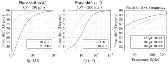 When is equal to 200 k, it can be seen from Equation (3) that the value of only needs to be greater than 0.42 pF to satisfy the condition of circuit stability. However, the problem that cannot be ignored is that the phase shift is no less than 8 degrees within the operating frequency range (from 70 kHz to 350 kHz for a magnetic field range from 2 × 10 nT to 10 × 10 nT) when is 200 k and is no less than 0.42 pF. This causes an issue with the design of the phase-shift circuit. If an additional phase-shift circuit is connected, the phase-shift degree within the operating frequency range needs to be compensated to 90 degrees.