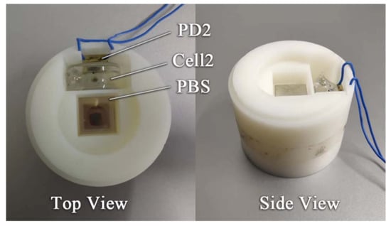 In the laboratory, the saturable absorption optical path is usually used to stabilize the frequency of a commercial laser [25]. In portable instruments, VCSELs are used as a substitute for commercial lasers. The heated buffer gas cell has a linewidth widening which is unsuitable for frequency stabilization. Therefore, an additional vacuum atomic cell is added to the magnetometer probe without increasing the volume; this is a small cylindrical cell with a diameter of 20 mm and a thickness of 10 mm. At the same time, a photodiode is close to it, as shown in Figure 4. Although the saturated absorption method exhibits better performance than the absorption method, the optical path needs to be integrated into the probe. The more complex the optical path is, the more noise is caused by the vibration, which is unfavorable for its application in instrumentation. In cases where the requirements of laser frequency stability are met, the optical path of the absorption method is simple and easy to build. The remainder consists of the frequency stabilization circuit. The VCSEL manual shows that the wavelength is positively correlated with the current and the temperature of the laser (0.5 nm/mA, 0.06 nm/°C). Therefore, the control of laser wavelength can be transformed into accurate control of current and temperature. The VCSEL frequency stabilization circuit in this work is shown in Figure 1 Part B.