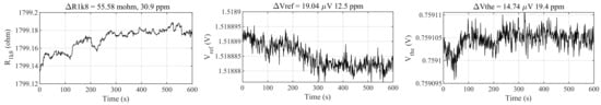 To evaluate the temperature stability of VCSEL, the data were recorded for five minutes (once per second) with an eight-and-a-half-bit Keysight 3458A multimeter. These data included (the value of 1.8 k low temperature drift resistance with accuracy of 0.01%); (the 1.5 V voltage reference obtained from external voltage reference chip REF5025 (noise: 3 Vpp/V, temperature drift: 3 ppm/°C) through precision low-temperature-drift resistance voltage division), and (the voltage applied to the thermistor of VCSEL after 1.8 k resistor voltage division). The data are shown in Figure 6.