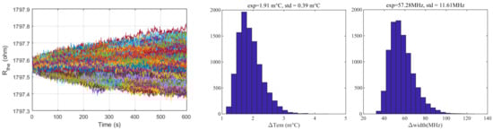 First, we used the random walk overlay white noise model with trend term to fit the above three data items and obtain their respective eigenvalues. Then, we obtained the relationship between and and between and V according to Ohm’s law. Monte Carlo simulations of the thermistor resistance () were performed to plot the trend of thermistor resistance values times, as shown in Figure 7; the statistical chart helps to evaluate the effect of temperature control. The average temperature fluctuation range of the laser does not exceed 0.002 °C, corresponding to the VCSEL frequency fluctuation range less than 60 MHz. This indicates that the best index of TEC temperature control for the MAX1978 is reached (±0.001 °C, as shown in the manual).