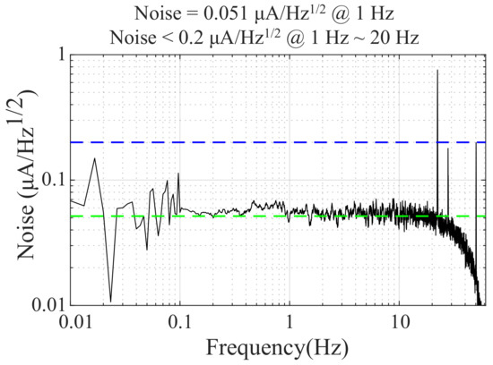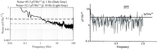 The noise power spectrum was tested in the laboratory, as shown in Figure 18 (left). We generated a measured magnetic field using a 3D printed Helmholtz coil at an angle of 45 degrees to the magnetometer probe with the Keysight B2902A as the current source. The output of the magnetometer was acquired with the Keysight 53230A frequency meter. We found that worse results are obtained if a current source with lower accuracy than the Keysight B2902A is used to generate the measured magnetic field in the laboratory. Therefore, it is necessary to evaluate the performance of the magnetometer in an accurate magnetic field [28]. The noise power spectrum was measured at the metering station as well, as shown in Figure 18 (right). The root mean square (rms) noise of the magnetometer is 3 pT/Hz as tested at the metering station.