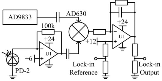 In this work, the value of is selected to be 180 pF and the value of is selected to be 200 k. Under this set of parameters, the maximum difference of the phase shift in the frequency range of 70 kHz to 350 kHz is not more than 3 degrees, as shown in Figure 3. Because the circuit is in the form of reverse amplification, the output is 90 degrees ahead of the signal observed on the photodetector.