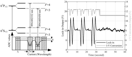 In this section, we evaluate the frequency fluctuation according to the fluctuation amplitude U of the lock-in amplifier output after the scanning process. The method is shown in Figure 12. In the scanning process, the time interval of the zero-crossing position of the lock-in output corresponding to the two absorption peaks (Cs-D1 line: 4→3 and 4→4) is recorded as T, and the time interval of the amplitude U of the lock output fluctuation when passing the target absorption peak (Cs-D1 line: 4→3) is recorded as t. The distance between the two absorption peaks of the Cs atom is a constant of about 1167 MHz. Therefore, the output of the stable lock-in amplifier is sampled for one hour to obtain the fluctuation amplitude U. For Figure 12, U = 2.7 V, t = 0.16 s, and T = 4.38 s. According to Equation (8), the corresponding fluctuation range is 43 MHz.
