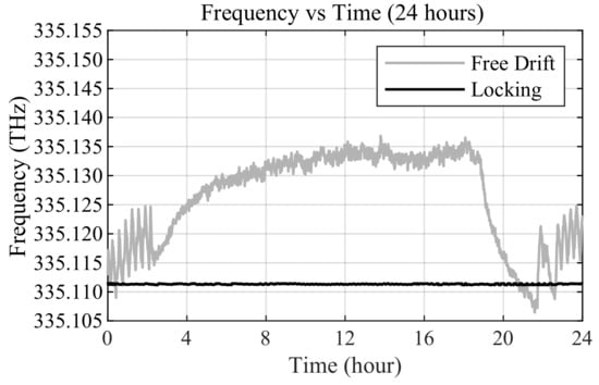 The wavelength was measured at PD1 with the 671B wavelength meter. Because of the limited accuracy of the wavelength meter, it was not used to evaluate the short-term frequency stability; instead, the wavelength was recorded for a long time. We monitored the stable VCSEL wavelength for 24 h and plotted the data, as shown in Figure 13. Compared with the uncontrolled (free drift) VCSEL frequency, this has a better stability effect. During the whole measurement time, the measured data are within the minimum accuracy (0.0008 nm, corresponding to 300 MHz linewidth) of the wavelength meter. It can be inferred that the frequency drift rate is less than 12.5 MHz/hour.