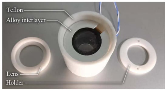 An AC heating scheme was realized after comparing various schemes. A structure that keeps the heating wire away from the atomic cell is proposed to eliminate the interfering magnetic field, as shown in Figure 14. The atomic cell is placed in the groove of a non-magnetic alloy heat-conducting interlayer. The interlayer is placed in an insulation shell made of Teflon. The shell is matched with anti-reflective lenses to keep the vapor cell in a closed space, slow the heat loss, and keep the interior warm. The heat-conducting interlayer increases the distance between the heating wire and the atomic cell while conducting the heat to ensure that there is almost no magnetism at the atomic cell. The remanence decreases with the third power of distance. The symmetrical heating wires counteract the magnetic fields of equal amplitude and opposite directions. As the AC frequency is far from the Larmor frequency, the noise can be filtered out.