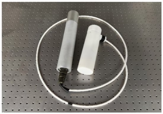 The integrated portable self-oscillating VCSEL-pumped cesium atomic magnetometer is shown in Figure 16. The optical path is integrated into a cylindrical probe with a diameter of 70 mm and a length of 180 mm. The circuit is integrated into a cylindrical metal barrel with a diameter of 62 mm and a length of 350 mm.