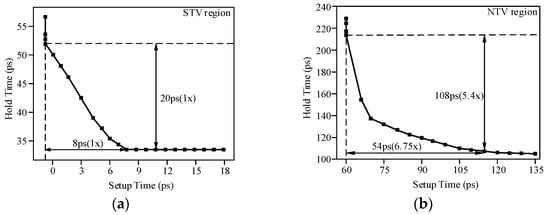 - Golanbari, M.S.; Kiamehr, S.; Tahoori, M.B. Hold-time violation analysis and fixing in near-threshold region. In Proceedings of the 26th International Workshop on Power and Timing Modeling, Optimization and Simulation (PATMOS), Bremen, Germany, 21–23 September 2016; pp. 50–55. [Google Scholar] [CrossRef]