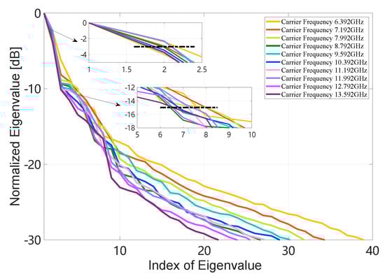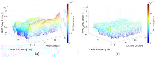 - In general, the changes of RMS delay spread are more significant in the perspective of carrier frequency than antenna elements. As explained above, the high carrier frequency causes high path loss and decreases RMS delay spread.