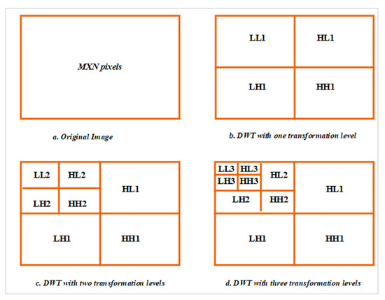 The low-frequency part includes the main information of the signal while the high-frequency part includes information related to the edge components. From these sub-bands, the LL is the most sensitive part since it contains most of the energy and serves as the base of the image. The other three sub-bands are of interest for watermarking due to the imperfection of the human visual system. Using several layers of decomposition makes the watermarking more robust and difficult to manipulate [32].
