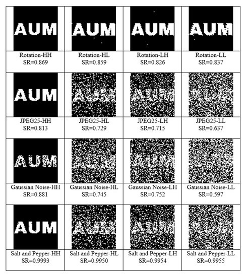 - Ernawan, F.; Kabir, M.N. A blind watermarking technique using redundant Wavelet transform for copyright protection. In Proceedings of the 2018 IEEE 14th International Colloquium on Signal Processing & Its Applications (CSPA), Penang, Malaysia, 9–10 March 2018; pp. 221–226. [Google Scholar] [CrossRef]