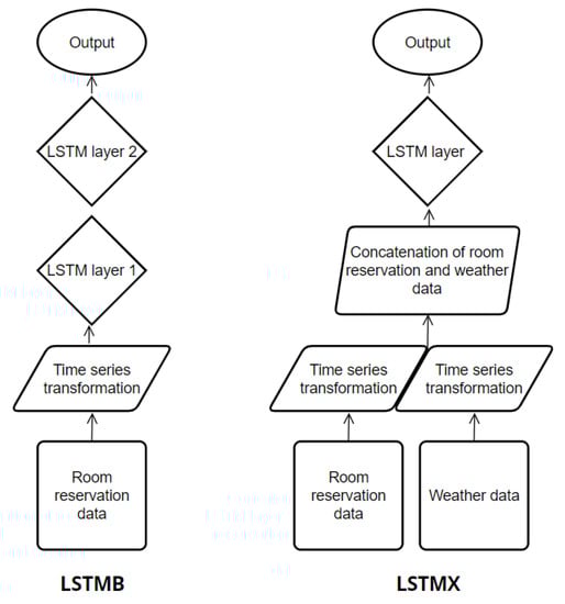 Regarding the data configuration, in this case, we applied the time series transformation process on both the room reservation and the temperature time series with . The result of the application of the data transformation process on the weather time series was a set of training samples of the form , where and . We kept only the part of these samples and concatenated it with the vectors of the LSTMB models, which produced the final training samples of the form , where and . Again, the partial training sets that corresponded to the m room reservation time series were concatenated in order to generate the overall training set. Each of the new deep learning architectures combined with the above data configuration process composes the second type of deep learning models we have built, referred to hereafter as . The proposed deep learning models for long-term tourism demand forecasting are schematically depicted in Figure 2.
