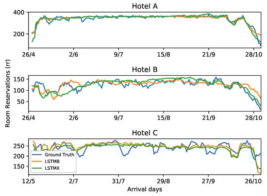The forecasting performance results of both the proposed and the benchmark models for all hotels are presented in Table 6 and schematically in Figure 5. As shown in the table, in most cases the proposed deep learning models outperform the benchmark models. Additionally, the LSTMX model that integrates weather data outperforms the LSTMB model in two out of three cases. This result validates the correctness of our assumption that the integration of values from exogenous variables (e.g., temperature) can increase the forecasting accuracy of an LSTM-based tourism demand forecasting model, provided that these variables are well-correlated to the demand variable.