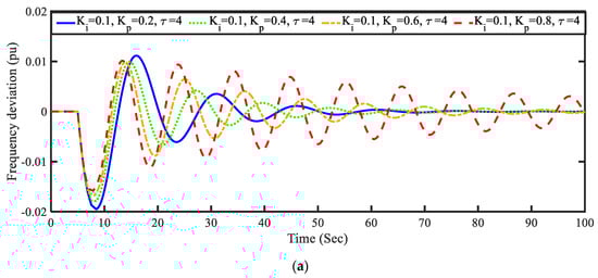 Figure 10 shows the impact of changing the PI controller and delay parameters on the LFC system. According to Figure 10a, it can be inferred that whenever the parameter increases while maintaining a steady and delay, the settling time increases, but the rising time is shortened. Additionally, as rises, the rising time decreases, which finally causes the LFC system to become unstable (Figure 10b). The performance of the LFC system can be affected by increasing the time delay. In other words, when the delay value is significant, and the PI parameters are incorrectly chosen, the power system becomes unstable. This fact is shown in Figure 10c.