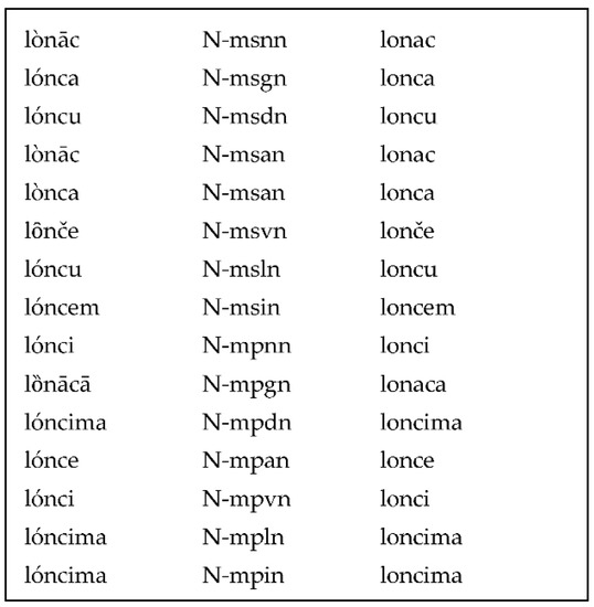 Entries in the lexicon [8] for the word lonac (En. pot) and its inflectional forms.