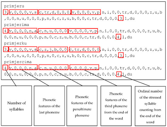 Figure 2 shows an example of a set of labels used by the model to predict the stress type. For each entry, there are 55 attributes compiled according to Table 4. The examples in the figure show that some of the words differ in the following features: the number of syllables, phonetic features of the last three phonemes in the word, and ordinal number of the stressed syllable counted from the end of the word. The other features are the same for all words in this example. This is because they have the same beginning (prímjer) so the phonetic features of the first seven phonemes are the same. The last attribute is the category attribute. There are altogether five possible categories—four types of stress and zero stress (ks, ku, du, ds, 0).