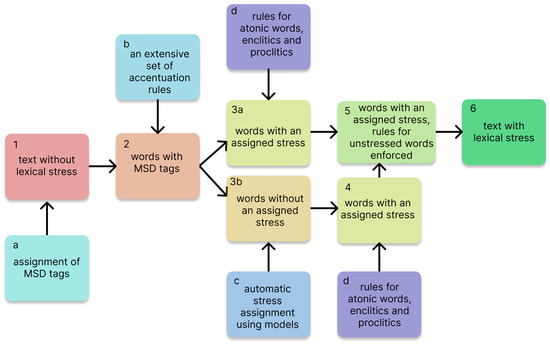 A schematic representation of the proposed hybrid approach is shown in Figure 3. It shows all the procedures required to obtain a final result—a text with lexical stress assigned (label 6 in Figure 3) from a text without lexical stress (label 1 in Figure 3). We can see that the first step was the MSD tagging (label a in Figure 3) of the text without lexical stress. After tagging, we obtained the text containing the words with their MSD tags (label 2 in Figure 3). Then, we applied an extensive set of rules described in [11,38] (label b in Figure 3). As a result, we obtained words with assigned stress (label 3a in Figure 3) or words without assigned stress for the OOV words (label 3b in Figure 3). For the OOV words, we performed automatic stress assignment using machine learning models (label c in Figure 3). Finally, we had all words with assigned stress (labels 3a and 4 in Figure 3). Next, we enforced the rules for atonic words, enclitics, and proclitics (label d in Figure 3). In this way, we obtained words with assigned stress and enforced rules (label 5 in Figure 3), which was our final goal—a text with assigned lexical stress.
