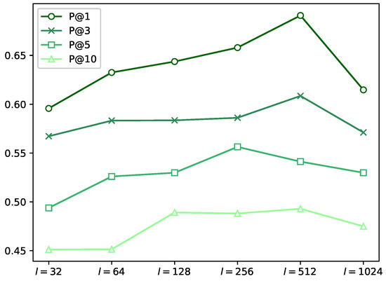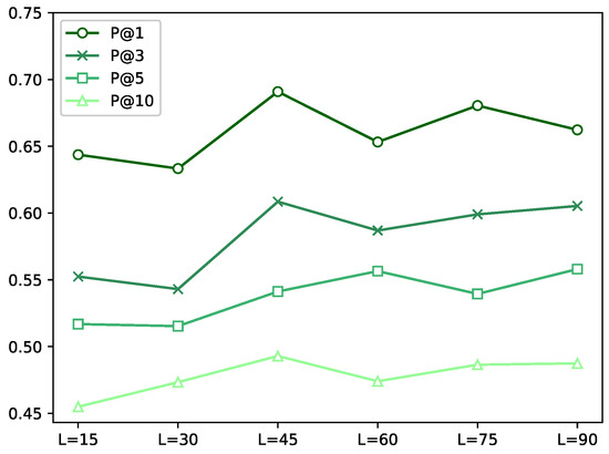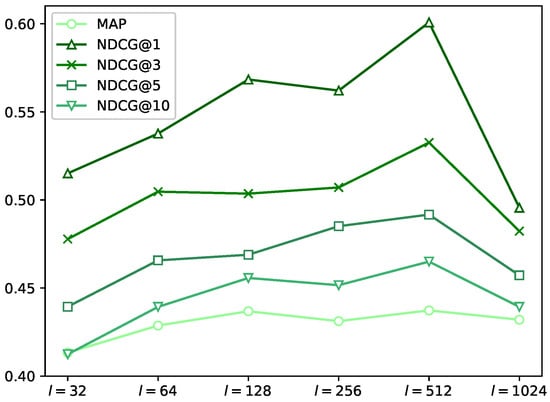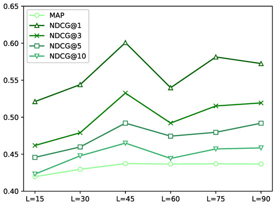 For model evaluation, we adopt three categories of evaluation metrics that are commonly used in existing document retrieval algorithms [24]: mean average precision (MAP), precision at position k (P@k), and normalized discounted cumulative gain at position k (NDCG@k). Note that all evaluation scores in our experiments were computed under the trec_eval public code (The trec_eval program is available from the TREC web site http://trec.nist.gov, accessed on 10 August 2022).