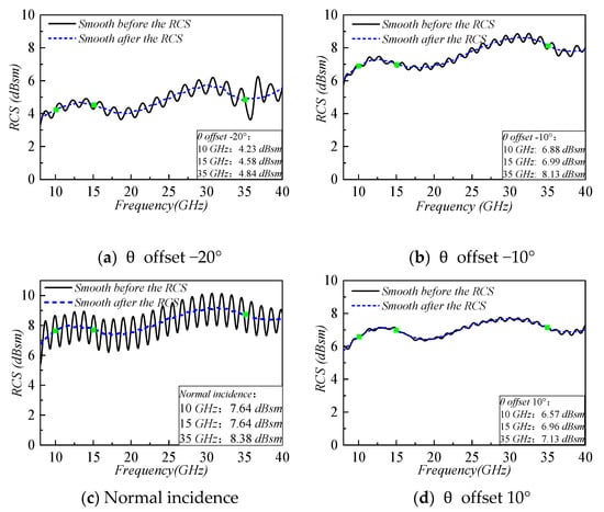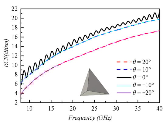 Equation (3) shows that the RCS change is independent of its size and effective reflection area and is only related to the incident electric field and scattered electric field, i.e., to the reflection coefficient on each surface of the TCR. For the TCR composed of a metal plate with an edge length of a = 200 mm, the backward RCS is also different at different incident angles. The metal TCR was simulated and calculated using CST simulation software. The excitation type we set was the plane wave simulated in the time domain solver, using the RCS value of the probe to detect. The simulation results of the backward RCS detected by the probe at different incident angles can be obtained, as shown in Figure 1.