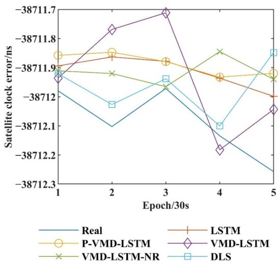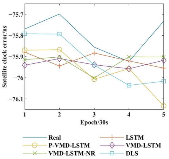 By decomposing the data, the DLS method retains the decomposed low-frequency components directly and reduces the noise of the decomposed high-frequency components. Therefore, this method is suitable for time series prediction, where the high-frequency information is not dominant and the low-frequency information is dominant. This test selects datasets with such characteristics as the main test objects, among which the satellite clock error data and the stock data are more representative. In order to ensure the reliability of the experimental results and avoid the contingency of the experimental results, multi-group datasets are set up for test analysis. The selected data can be divided into two types, the first is GPS satellite clock error data from IGS, and the second is stock data from financial circulation. The first type uses the final satellite clock error data with a sampling interval of 30 s, and the compressed clock error file igs21526.clk_30s can be downloaded from the website ftp://garner.ucsd.edu/pub/products/ (accessed on 8 June 2022). The file is the clock error data with a sampling interval of 30 s on 10 April 2021, and the satellite clock error sequences of G05 and G24 are extracted as experimental data. The second type uses the closing price transaction dataset of the Shanghai and Shenzhen 300 Index (CSI300), the closing price trading dataset of the Shanghai Composite Index and the closing price trading dataset of the Shenzhen Component Index, which can be downloaded from the website https://money.163.com/stock/ (accessed on 8 June 2022). The closing price trading dataset of the CSI 300 is the daily closing price trading data from July 2005 to June 2021, the closing price trading dataset of the Shanghai Composite Index is the daily closing price trading data from October 2005 to April 2022 and the closing price trading dataset of the Shenzhen Component Index is the daily closing price trading data from October 2005 to April 2022.