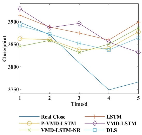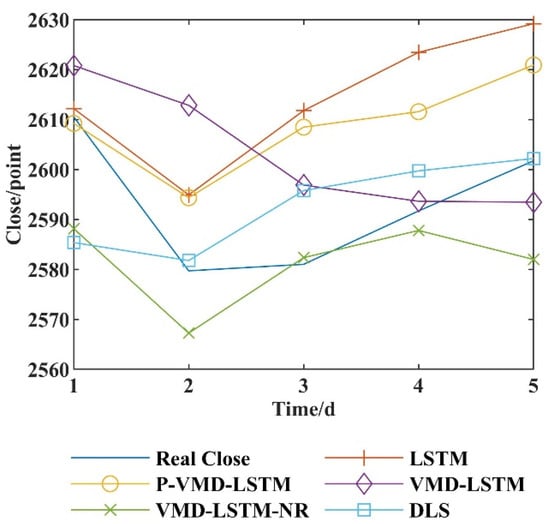 The comparison results of the prediction evaluating indicators of the Shanghai Composite Index and the Shenzhen Component Index are shown in Table 4 and Table 5. It can be seen from Table 4 that all the four evaluating indicators of the DLS method are the lowest, and MSE, MAE, MAPE and SMAPE are, respectively, reduced by 13%, 15%, 15% and 15%, compared with the VMD-LSTM-NR method. It can be seen from Table 5 that all the four evaluating indicators of the DLS method are the lowest, and MSE, MAE, MAPE and SMAPE are, respectively, reduced by 13%, 9%, 9% and 9%, compared with the P-VMD-LSTM method. Therefore, it indicates that the DLS method has good prediction ability.