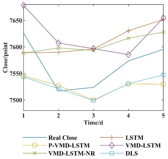 In Figure 5, the effect of the DLS method is significantly better than the other comparison methods. Except for the fact that there are deviations of the prediction value and the direction trend in the last step, the prediction results of the other steps have good effects. However, other comparison methods can only have good results in the first half or the second half of the prediction, which shows that these methods are significantly worse than the DLS method.