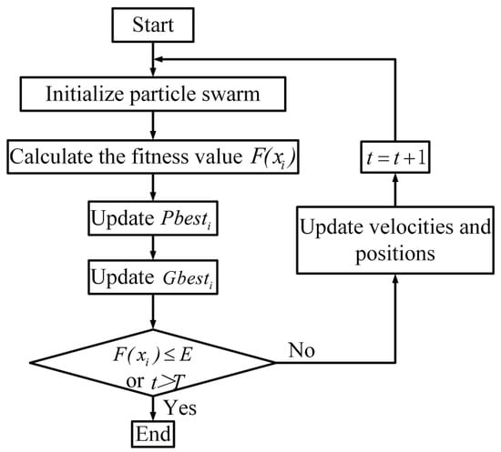 represents the position of the i-th individual in the d-dimensional search space at the current PSO iteration to the g-th generation, represents the speed of the i-th individual in the d-dimensional search space, represents the historical optimal position of the i-th individual in the d-dimensional search space, represents the optimal position of all individuals of the entire population in the d-dimensional search space during the optimization process. and represent the learning rates for learning from the i-th individual historical optimum and the global optimum, respectively, and is the random number between [0, 1]. The flow of the PSO algorithm is shown in Figure 3.