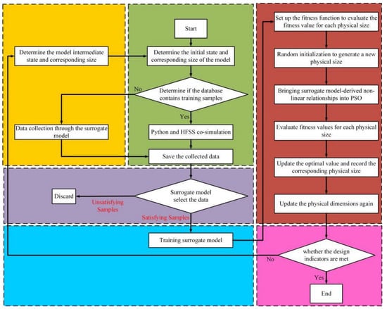 In this experiment, the particle dimension is 4 (the number of geometric parameters is 4). The number of particles is 100. The maximum number of iterations is 100. The acceleration factor c1 = c2 = 2. Once initialization is complete, a new set of geometric parameters is generated at random, bringing surrogate model-derived non-linear relationships into PSO. The resulting geometric parameters are fed into the surrogate model and the S-parameters are obtained by prediction. Calculate the fitness function for each particle. Update and .
