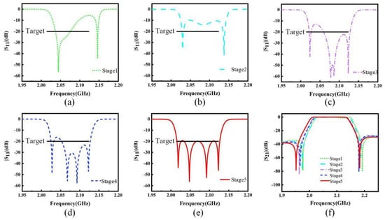 During the design of the microwave filter, the initial state of the filter is not ideal, use this stage as stage 1. The of the filter before optimization is −5.3 dB, corresponding to the geometric parameters taken as = = = = 10 mm. The response results of the PSO algorithm iteration are shown in Figure 9. The initial state is shown as the first stage in Figure 9.