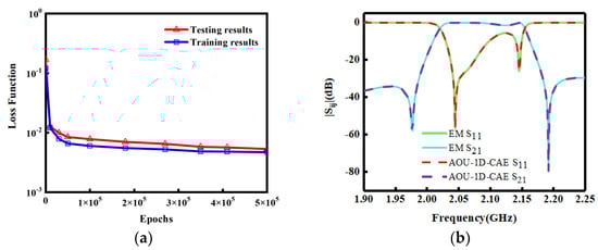Then start building the AOU-1D-CAE surrogate model. AOU-1D-CAE is a combination of AE and CNN. Generally divided into two parts, encoder and decoder. Train the surrogate model. The collected data samples were put into the surrogate model and the neural network was trained. , , , from a real sample is used as input to the surrogate model, with each S-parameter consisting of 301 points. First, an encoding operation is performed. In the encoder, the input matrix is 301 × 4. After three mutually alternating convolution and pooling layers, the matrix becomes 26 × 32. After flattening the matrix becomes a vector, and then after a full-connected layer, prediction is performed. The output of the encoder is the corresponding geometric parameter obtained by the prediction of the S-parameter. The output of the encoder is then used as the input to the decoder for the decoding operation. After three fully connected layers in the decoder, the network is then reshaped to a matrix 301 × 4. The loss function of this network is Equation (12). The neural network learns the non-linear relationship between the geometrical parameters and the corresponding S-parameters and is able to predict the physical performance corresponding to any set of geometrical parameters with a loss function that meets the criteria. After building the surrogate model, the surrogate model was trained on NVIDIA Geforce GTX 1060 6 GB using the GPU environment. Experiments show that it takes 7 min to train the network using the GPU environment and 27 min using the CPU environment. Each time the surrogate model is trained, the prediction accuracy of the network is checked. A random set of geometric parameters X is chosen to be placed into the AOU-1D-CAE and the network outputs a set of S-parameters. Figure 10a illustrates the training and testing performance of the network. It can be seen that the model has a faster convergence rate and higher accuracy as the number of training sessions increases. Figure 10b presents a contrast between the HFSS simulation results and the predicted results from the AOU-1D-CAE model. It can be seen from Figure 10 that the results match exactly.