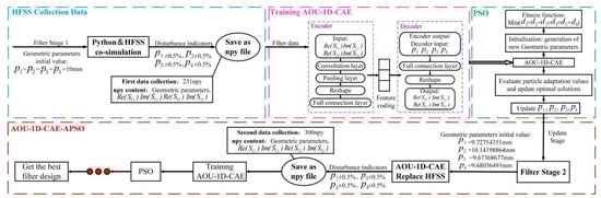 This paper presents a new microwave filter design approach, AOU-1D-CAE-APSO. The AOU-1D-CAE-APSO model is simple in structure and low in complexity. AOU-1D-CAE can adaptively update the content and network parameters of the dataset. Replacing EM simulation software for data collection reduces computational costs and training time. The selection function is added to automatically delete the data that is not in the collection range. At the same time, PSO performs phased optimization and updates the phase optimal solution in time. By inputting the continuously updated stage optimal solution into the PSO, the final optimal solution is obtained through optimization. The final optimal solution refers to the solution that finally meets the design criteria. Avoid falling into the local optimum and ensure the feasibility of the solution.