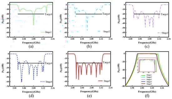 Fourth−order cavity filter HFSS verification of the optimized response in PSO iterations. (a–e) Reflection coefficient . (f) Transmission coefficient .