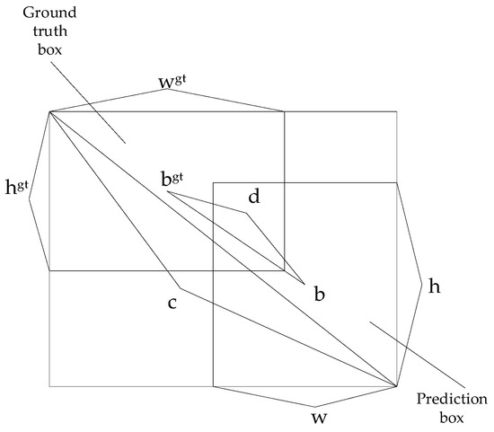 where represents the Euclidean distance d between the centroids of the prediction box and the ground truth box, IoU represents the ratio of intersection and union of the prediction box and ground truth box. The calculation method of is shown in Equation (4). The calculation method of is shown in Equation (5).