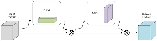 The attention mechanism module is inserted after two upsampling and two downsamplings in the PANet structure to enhance the feature extraction of the input feature map. The role of the attention mechanism module is to adaptively make CNN pay attention to important features. In general, it can be divided into CAM and SAM. The CBAM proposed by Woo et al. [34] is an excellent combination of the CAM module and the SAM module, which can achieve better results, and its structure is shown in Figure 7.