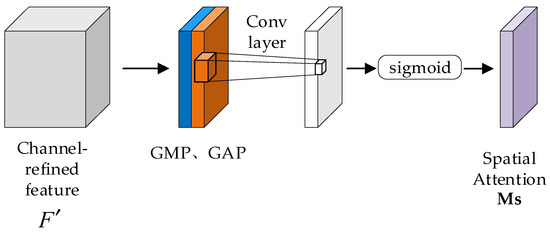 The second half of CBAM is the SAM module. It takes (C × H × W) through a global maximum pooling and global average pooling based on the number of channels to obtain two H × W × 1 feature maps. The two feature maps are channel-spliced and then subjected to a 7 × 7 convolution operation to reduce the dimension to H × W × 1. Finally, the weight (MS) of each channel of the input feature is obtained by sigmoid. Then, it multiplies MS with the corresponding elements of the input features to obtain the final feature map (C × H × W) and complete the spatial attention operation. The SAM structure is shown in Figure 9.