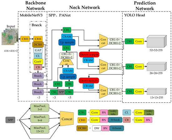 MC-YOLOv4 network structure model. Conv represents the convolution; BN represents the batch normalization; DW represents the depthwise separable convolution; GAP represents the global average pooling; Up sample represents the upsampling; Down sample represents the downsampling; MaxPooL represents the maximum pooling; Concat represents a feature fusion method of adding the number of channels; CBAM represents the convolutional block attention module; Leaky relu and H-Swish represents two kinds of activation function.