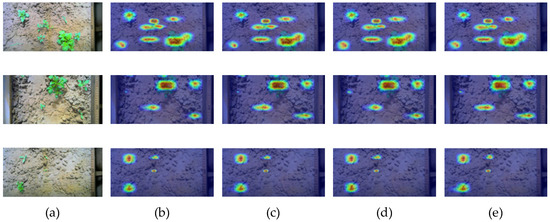 Three sets of visual heatmaps of the attention mechanism. (a) Original images representing three groups of potatoes and weeds, (b) represents the results of the heat map using the base model, (c) represents the heat map results using the base model and the SENet attention mechanism module, (d) represents the heat map results using the base model and the ECANet attention mechanism module, (e) represents the heat map results using the base model and the CBAM attention mechanism module.