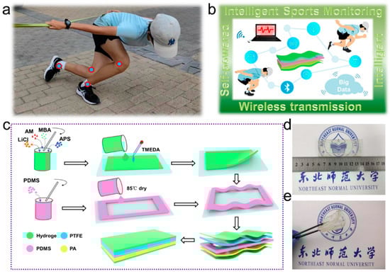 Application scenarios and production process of SD-TENG. (a) Application of SD-TENG in speed skating land training. (b) Application of SD-TENG in smart sports monitoring. (c) The fabrication process of SD-TENG. (d) The optical photograph of SD-TENG. (e) The photograph of SD-TENG’s flexible display.