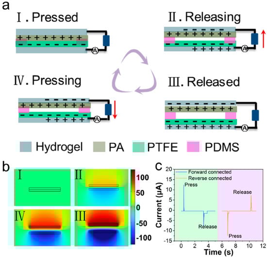 The SD-TENG mechanism. (a) Schematics of the operating principle of the SD-TENG. (b) COMSOL simulations were performed to clarify SD-TENG’s working principle. (c) Switching polarity test of SD-TENG.