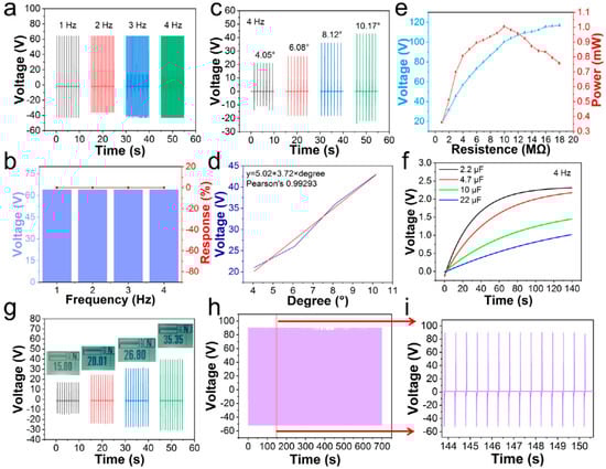 The electrical output performance of SD-TENG. (a) Relationship between the frequency and output voltage of SD-TENG for the same bending angle. (b) The voltage responses of SD-TENG at different frequencies. (c) Relationship between the angle and output voltage of SD-TENG at the same frequency. (d) Linear fit between the output voltage and bending angle of SD-TENG at the same frequency. (e) The voltage and power of SD-TENG under different load resistances. (f) The SD-TENG charging the 2.2 μF, 4.7 μF, 10 μF and 22 μF capacitors. (g) The test of the SD-TENG response to force. (h) The stability test of SD-TENG. (i) Details of the stability test.