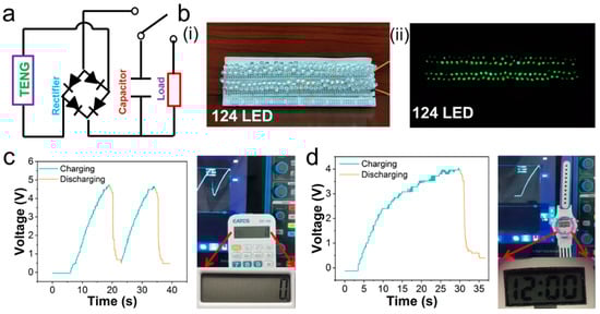 Power supply performance test of SD-TENG. (a) Equivalent circuit diagram of SD-TENG for charging and discharging. (b) The SD-TENG is used as a power supply to light up 124 green LEDs. (c) The SD-TENG charges a calculator. (d) The charging of an electronic watch.
