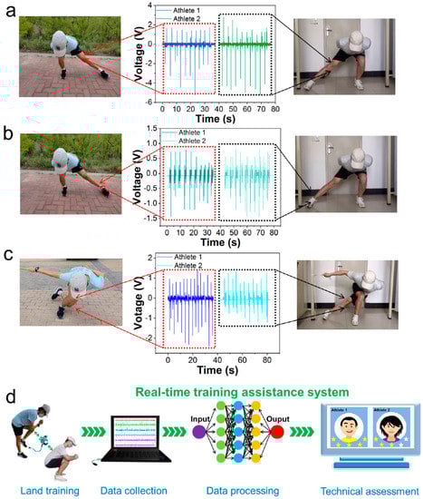 Speed skating land exercise, also known as land imitation exercise, is an indispensable basic exercise method. Reasonable and effective land exercises can not only lay a good foundation for athletes but also improve the physical qualities related to speed skating. In the training process, according to the technical characteristics of the ice and target muscle groups to be trained, land training movements are designed. Examples include the performance side stirrups and bent knee walk exercises in straight road land training and belt traction bend imitation exercises in road bend training. In this work, our main focus was the monitoring of side stirrup training and belt traction training in land training. Figure 5a shows the output voltage of the knee flexion during the side stirrup exercise performed by two athletes. By comparing the output voltage plots of the two athletes, it can be seen that the output voltage curve of Athlete 1 is smoother than the output voltage curve of Athlete 2. The smoother the curve is, the better the stability of the athlete’s knee joint is. In the high-speed gliding state, the knee joint stabilization ensures a low center of gravity of the body, which contributes to the reduction in wind resistance. Figure 5b shows the output voltage of the ankle joint angle change during the side stirrup exercise performed by the two athletes. By comparing the output voltage graphs of the two athletes, it can be seen that the low peak of the output voltage curve of Athlete 1 is in front of the high peak. This is caused by a different movement of the ankle joint. In speed skating ice training, when an athlete wearing a skate completes a side stirrup movement, the side stirrup foot is stretched out in parallel until the knee is fully extended. Afterward, due to the fact that the blade of the clap ice skate can be separated from the heel of the skate, the athlete’s side stirrup foot undergoes a plantarflexion process, in which the athlete can obtain a continuous propulsive force. The output voltage graph for Athlete 2 has a low peak in front of the high peak, indicating that Athlete 2 has plantarflexion of the skating foot before the knee joint is fully extended. The intuitive impact of this occurrence on the ice is poor skating and a slow speed improvement. Assistance simulation training occupies an important place in sports training, as it can help athletes to master the technical movements by reducing the difficulty of the sport, and help them the motor skills to develop from the generalization stage to the automation stage. Figure 5c shows the voltage output of the knee joint bending angle change during the belt traction imitation exercise for the two athletes. Athletes require great leg strength to overcome the centrifugal forces during cornering on ice. Thus, the more explosive the athlete’s legs are, the faster the rate of the knee stirrups and extensions will be, demonstrating fast and stable cornering during the sport. Therefore, it is necessary to monitor the changes in the size and frequency of the knee joint angle during belt traction training. From Figure 5c, it can be seen that Athlete 1 completed the movement more times and with a greater amplitude than Athlete 2 in the same timeframe, indicating that Athlete 1 completed the bending simulation training with a fast frequency and full extension of the knee joint. Athlete 2 was slightly worse than Athlete 1. Therefore, the strength training of the leg muscles and ankle spreader muscles should be strengthened during the training. Figure 5d shows the operation mode of the SD-TENG-based wireless intelligent land-assisted training system. In land training, the SD-TENG is attached to the ankle and knee joints of the athlete, and the device detects and collects motion data when the angles of the ankle and knee joints change. The acquired motion data are transmitted wirelessly through the system’s transmitter to the data receiver and processed by the computer in real time, and finally, the athletes’ movement performance quality is rated in real time in the form of a visual interface (Supplementary Video S3). The combination of SD-TENG as a data source and the wireless intelligent land-assisted training system provides a reliable guarantee of the quality of speed skating land training.